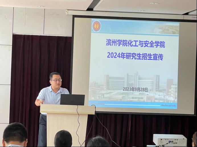 9月28日上午,滨州学院化工与安全学院副院长刘学文、硕士点建设负责人马有营博士和卞贺老师一行3人到我院进行研究生招生宣讲。本次宣讲会由化学化工学院院长助理耿龙龙博士主持,王新芳副院长、刘文博老师及2020级考研学生参加了宣讲会。