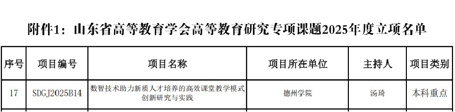 近日,山东省高等教育学会公布了高等教育研究专项课题2025年度立项名单,我院汤琦老师申报的项目《数智技术助力新质人才培养的高效课堂教学模式创新研究与实践》获批本科重点课题。