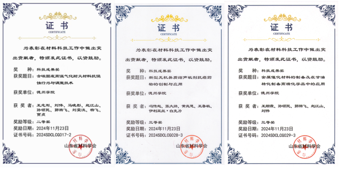 山东省材料科技成果由山东省材料学会组织,奖旨在表彰在省内材料领域科技工作中做出突出贡献集体和个人。化学化工学院3项成果的获奖实现了在该成果上的新突破,是学院近年来积极开展科研团队建设的体现,也为学院学科建设打下了基础