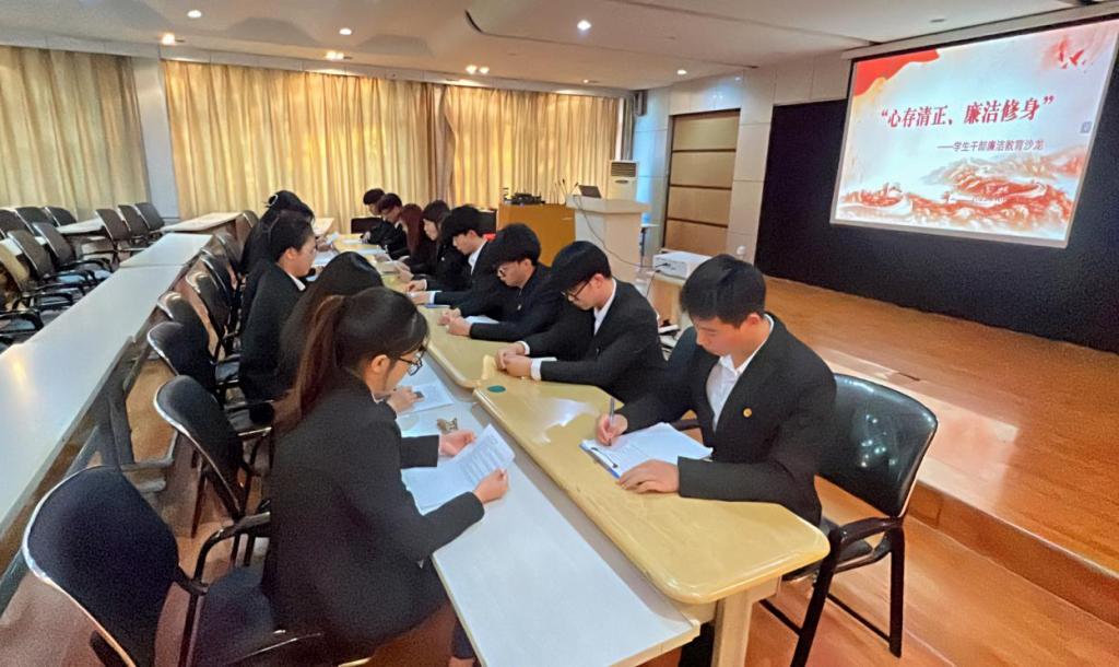 活动中,主讲老师分别从“什么是廉洁”“为什么讲廉洁”以及“如何做到廉洁自律”三部分进行深刻解读,并提出学生干部要以身作则,加强廉洁自律,提高自身修养,发挥模范作用。学生干部结合自身学习、工作和生活感悟依次分享自己对于廉洁文化的认识,大家纷纷表示时时清醒、刻刻警惕,扣好廉洁自律的“第一颗扣子”。会后,为与会学生干部分发廉洁文化主题书签,大家在上面留下自己关于廉洁的座右铭。