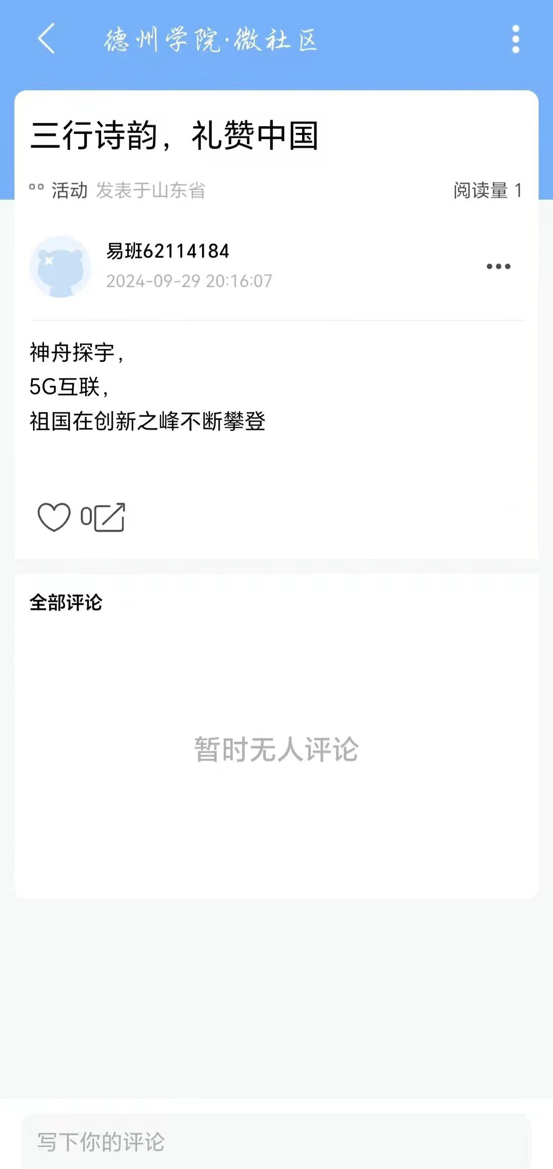 在国庆佳节来临之际,为激发同学们的爱国情怀,表达对祖国的热爱与赞美,10月1日到10月5日化学化工学院举办“三行诗韵,礼赞祖国”线上易班活动。