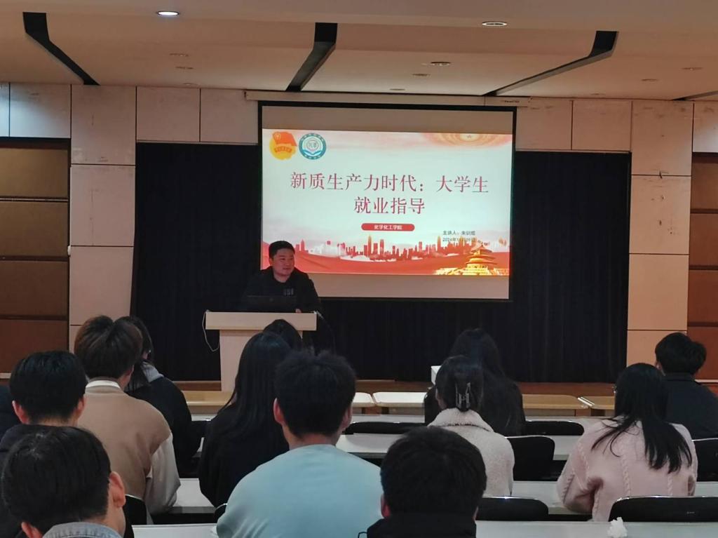为帮助大学生了解新质生产力时代就业市场的需求和趋势,掌握就业技巧和方法,明确自身就业规划方向和目标,11月9日,化学化工学院于求实楼0215教室组织开展“新质生产力时代:大学生就业指导”青马培训课程。学院分管就业工作的辅导员主讲,培训班学员40余人参加。