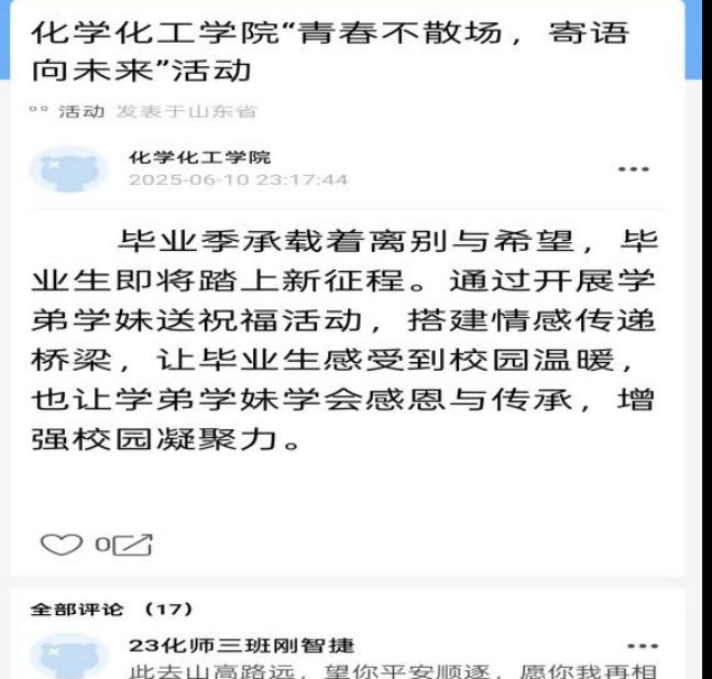 为了寄语毕业生,为他们送上美好祝福,凝聚青春力量。化学化工学院于6月13日举办“青春不散场,寄语向未来”活动。参与同学将自己对毕业生的寄语与祝福,通过易班参与发布,共同书写了一场关于成长与告别的温暖篇章。