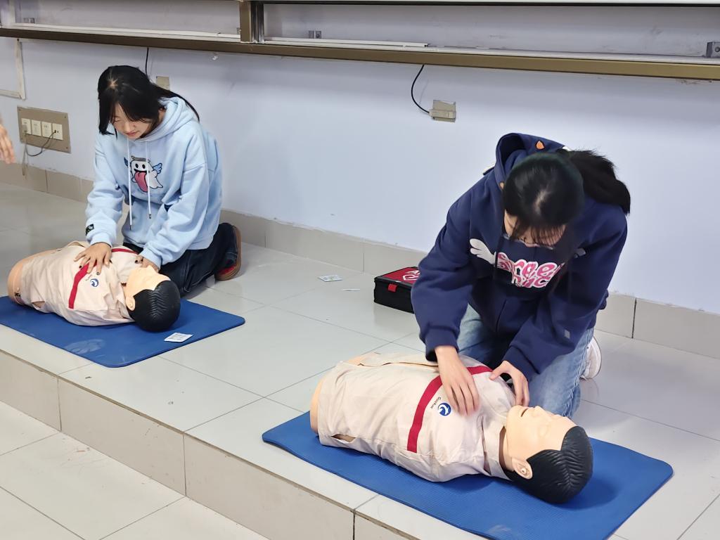 本次培训采用“理论传授+实操练习”的双线模式展开。专业人员依托真实案例,系统讲解了心肺复苏、海姆立克急救法及AED使用等核心急救知识,并着重阐述了“黄金四分钟”这一挽救生命的关键概念,强化同学们的急救意识。在实操环节,专业人员借助模拟人体教具,现场演示心肺复苏的标准流程,详细讲解按压部位、频率、深度及人工呼吸配合要领。同学们踊跃参与练习,在一对一专业指导下反复打磨动作、纠正偏差,切实将理论知识转化为应急实战能力。