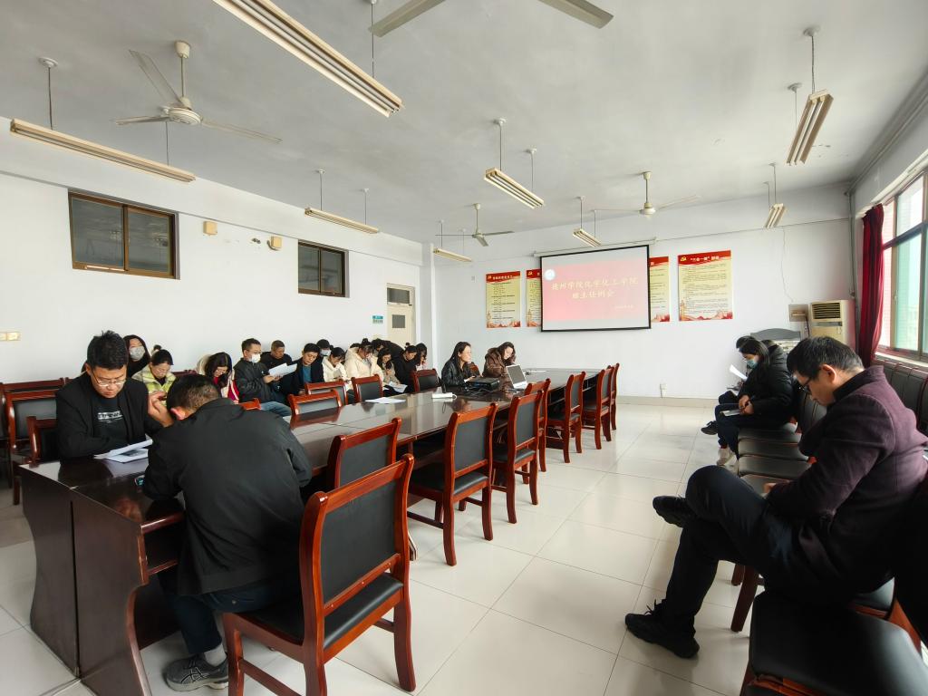 为贯彻落实学校本科教育教学审核评估学生工作动员部署会议精神,学习《大学生文明素质养成专项工作方案》文件精神,促进学院学生工作提质增效,4月2日,化学化工学院于求实楼504召开班主任工作例会,化学化工学院党委副书记、全体辅导员、班主任老师参会。
