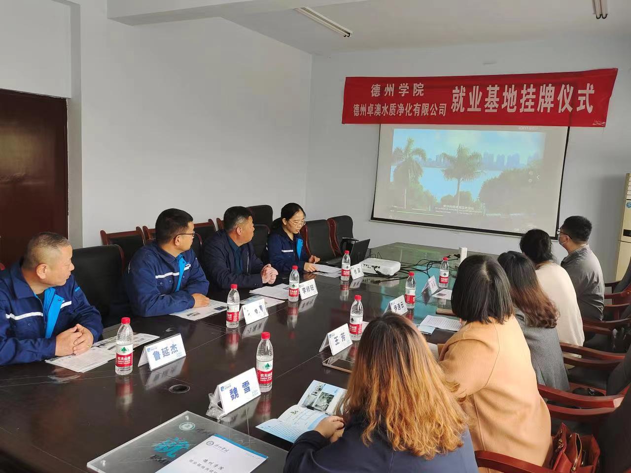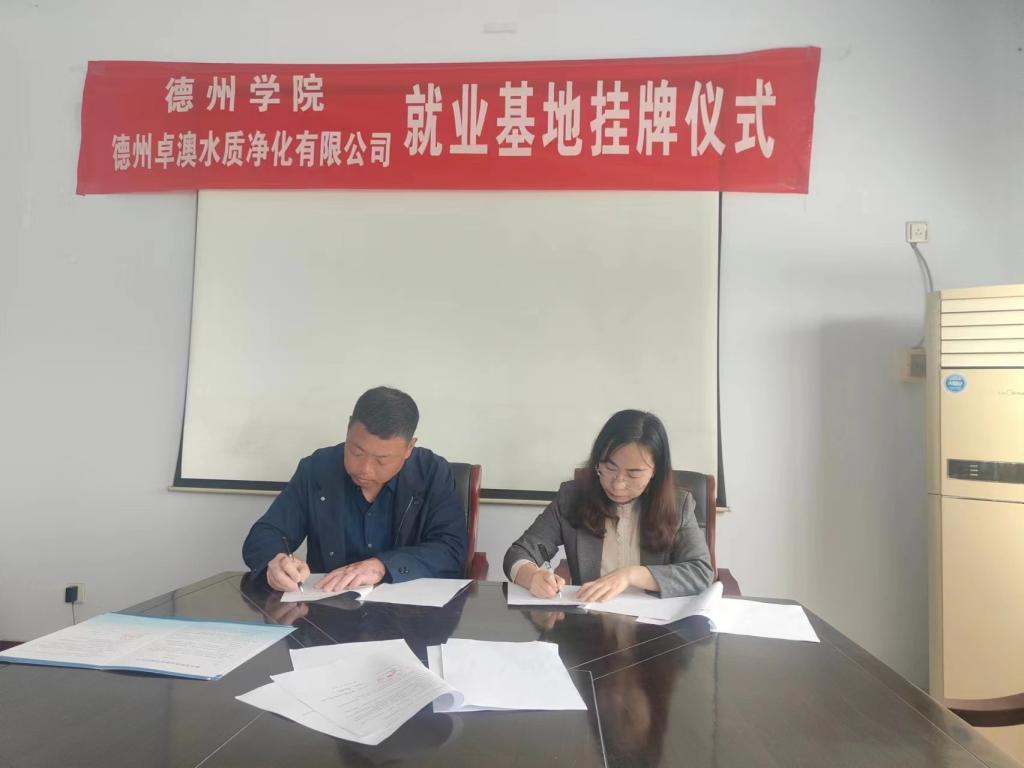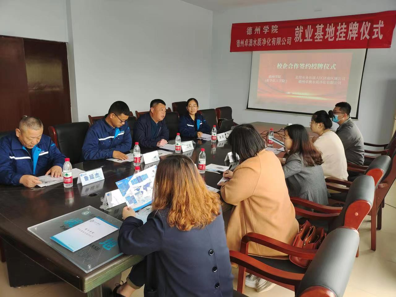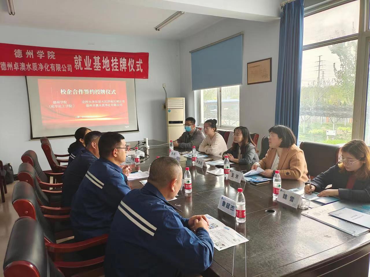 仪式上,公司总经理详细介绍了公司发展历程,工业废水、生活废水的处理流程及公司发展战略,希望能够加强校企合作,织就“共生共赢”网。化学化工学院党委书记就学院的师资力量、人才培养模式、学生就业工作、科研情况做了详细介绍。双方一致认为,要将学校基础研究的优势与企业科技创新活力相结合,在高层次人才共享、联合研发平台建设以及学生就业等方面开展深度合作,共同服务地方经济社会发展。随后,双方签订《德州学院就业基地共建协议书》《实习实训基地协议书》,并进行授牌。