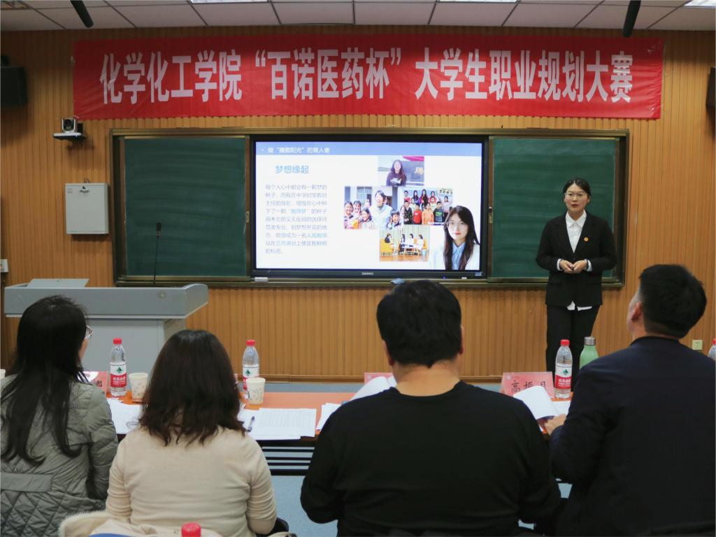 为贯彻落实学校《关于举办德州学院大学生职业规划大赛的通知》要求,加强学生生涯教育和就业指导,引导学生树立正确的成才观、就业观和择业观,提升学生就业竞争力,11月13日,化学化工学院联合百诺医药集团于厚德楼413教室举办了“百诺医药杯”大学生职业规划大赛决赛,就业指导处副处长、百诺医药集团相关负责人、化学化工学院党委书记、副书记及辅导员担任本次大赛评委,70余名学生代表到场观摩比赛。