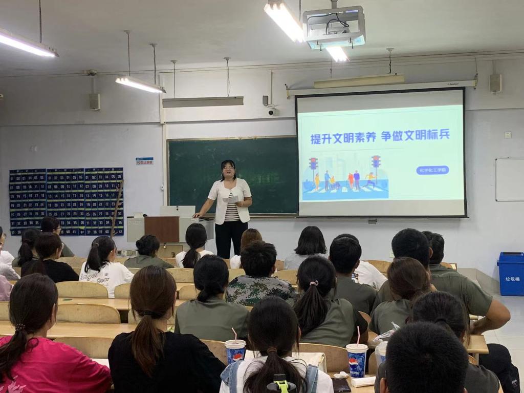 为进一步增强学生文明意识,提升人才培养质量,加强大学生思想道德水平和文明素养,引领学生积极践行社会主义核心价值观,化学化工学院于9月17日开展“提升文明素养,争做文明标兵”主题班会。