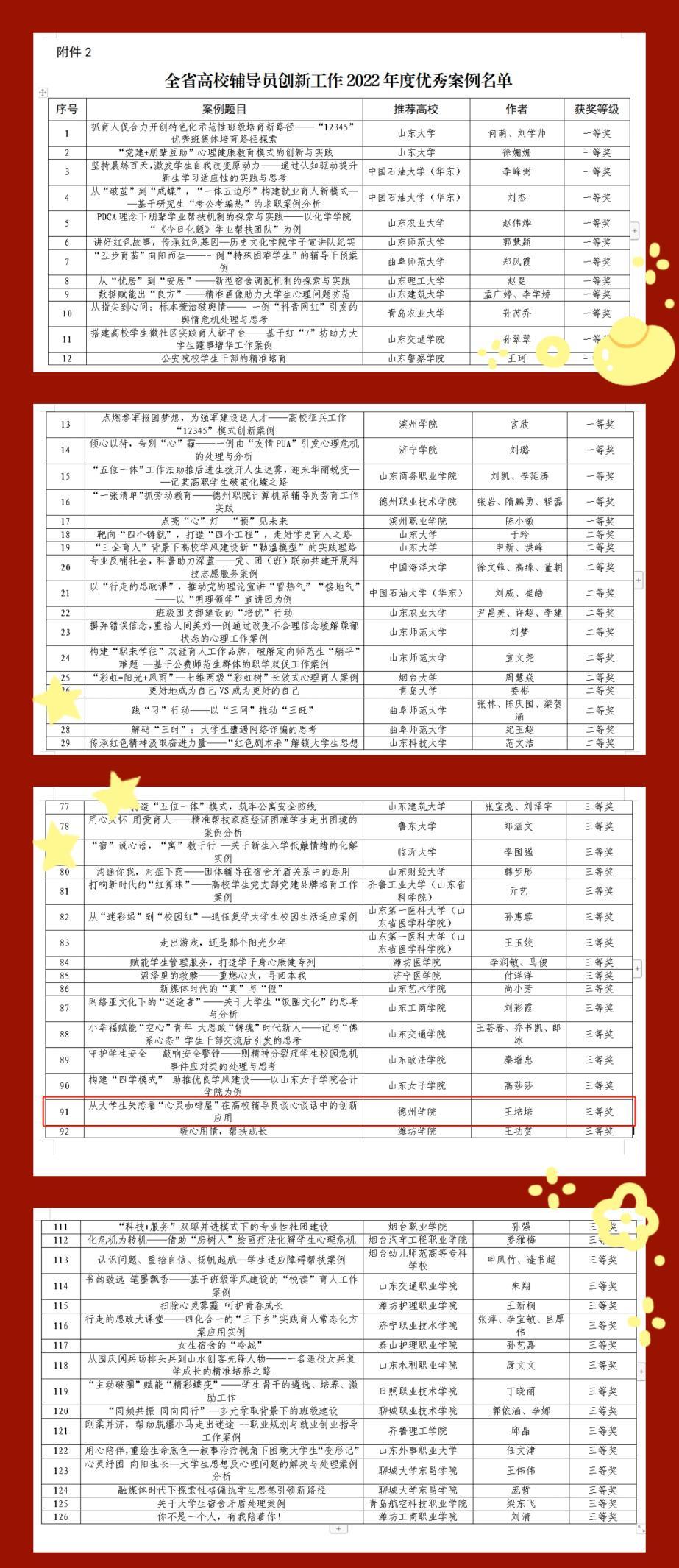 近日,中共山东省委教育工委公布了全省高校辅导员创新工作2022年度优秀案例评选结果。经各高校推荐申报、专家评审等环节,我院辅导员王培培老师的工作案例《从大学生失恋看“心灵咖啡屋”在高校辅导员谈心谈话中的创新应用》入选全省高校辅导员创新工作2022年度优秀案例,荣获三等奖。