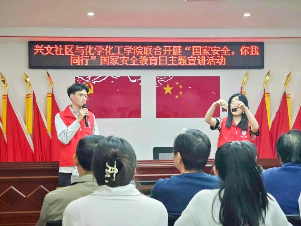为增强社区居民的国家安全意识和素养,营造和谐平安的社区环境。在全国第十个国家安全教育日来临之际,化学化工学院志愿者赴兴文社区开展“国家安全,你我同行”普法宣传活动。化学化工学院正青春低碳环保科技志愿服务队队员主讲,兴文社区居民参加。