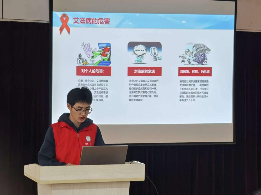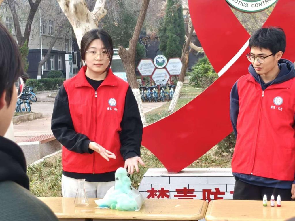 活动现场,志愿者利用色素在水中扩散现象和过氧化氢在催化剂的作用下迅速分解的原理,为同学们展示了针管滴色素实验和大象牙膏实验,形象地模拟了艾滋病通过共用针具传播的场景,类比了艾滋病病毒在人体内部的发病机制,展现了艾滋病的传播迅速的特点和防治艾滋病的重要性。紧接着,在求实楼215活动室里,志愿者通过用图片、文字和视频相结合的形式,生动形象地向同学们讲解了艾滋病的概念、危害、传播途径和预防措施等应知应会内容,提高了同学们对艾滋病的认知和理解,也激发了大家参与艾滋病预防和宣传工作的热情。