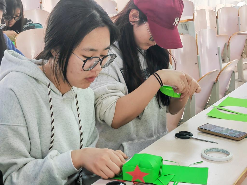 活动伊始,社团负责人通过视频和图文讲解雷锋帽制作过程,随后社团负责人为参与者分发了红绿色卡纸、双面胶等材料包,并现场演示了纸艺雷锋帽的制作步骤,在制作过程中同学们在动手实践中逐步还原雷锋帽的经典造型,同时融入个性化创意,作品完成后,同学们相互交流制作心得。