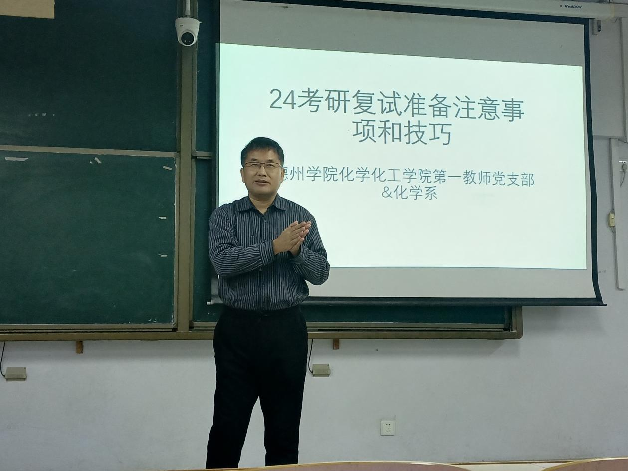 2024年化学化工学院化学专业考研上线率再创佳绩,达到51%,为了提高复试成功率,化学化工学院第一教师党支部(第三批全国党建工作样板支部培育创建单位)和贾春晓书记工作室(第二批全省高校“双带头人”教师党支部书记工作室培育创建单位),提前筹划、精心组织,从2月28日考研分数公布至今,组织了一系列活动助力学生考研复试。