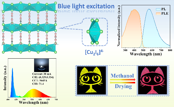 卤化铜(I)是白光发光二极管 (WLED)、闪烁体和光电探测器等先进光电子技术的理想材料,然而,设计和合成适用于蓝光激发的低维杂化卤化铜(I)仍然面临着挑战。研究团队通过调整有机组分4-甲基吡啶和无机成分CuI的比例,制备了两种一维杂化Cu(I) 基金属碘化物,即(C6H7N)CuI和(C6H8N)CuI2单晶。(C6H7N)CuI晶体不发光,而(C6H8N)CuI2晶体则表现出不寻常的黄色荧光,其宽的激发带位于260nm-500nm,展示了其蓝光激发特性。将(C6H8N)CuI2与商用430 nm蓝光芯片组装制备的WLED器件,色温(CCT)5645 K,CIE (0.329, 0.334),证明了(C6H8N)CuI2在蓝光激发的白光照明中的应用前景。另外,(C6H8N)CuI2晶体吸附甲醇显示红色荧光,但在吸附所有其他醇类则不会发出红色荧光。当晶体中的甲醇挥发后,可以恢复最初的黄色荧光,从而实现了可逆的荧光颜色转换。这项工作不仅WLED提供了一种蓝光激发的Cu(I)基金属碘化物,还提供了一种可逆检测甲醇的荧光传感器。