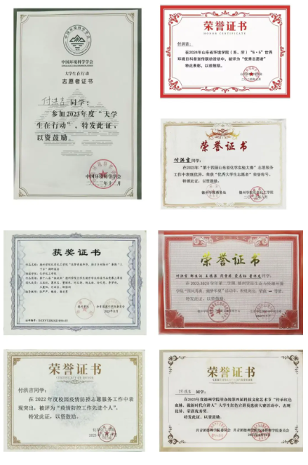 在团委“知行合一”的实践育人理念领导下,年度志愿时长达200小时,他积极参加了暑期三下乡社会实践活动,曾参加省重点团队“红色崔杨 逐梦红心”暑期三下乡社会实践、跟随队伍前往德州市柴胡镇崔杨村,开展“乡村振兴+讲好崔杨故事”系列活动5场,深度走访村民。曾跟随德州学院“清水绿滩”一叶舟社会实践队赴滨州市台子镇开展黄河调研。曾参与“筑梦青春年华,助力乡村振兴”社会实践队赴德州市小高店村开展乡村振兴社会实践活动。曾获山东省环境学院(系、所)“6•5”世界环境日科普宣传优秀志愿者、第十四届山东省化学实验大赛“优秀志愿者”。