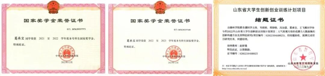 连续两学年学业成绩与综测成绩均位列专业第一名。曾获“2021-2022”学年国家奖学金、“2022-2023”学年国家奖学金、“2023-2024”学年国家奖学金、山东省优秀学生干部、山东省优秀学生、德州学院优秀大学生奖学金、综合一等奖学金、综合二等奖学金、十佳大学生、十佳学生干部、优秀学生干部、优秀共青团干部、三好学生等荣誉。